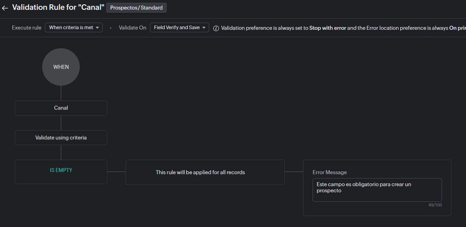 Regla de validación: obligatorio bajo condición lógica (IF/THEN), bloquea el guardado si no se cumple.