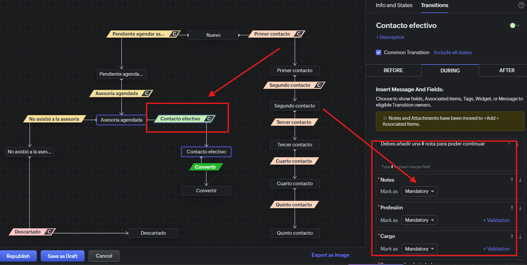El campo solo será obligatorio cuando el usuario ejecute esa transición específica.