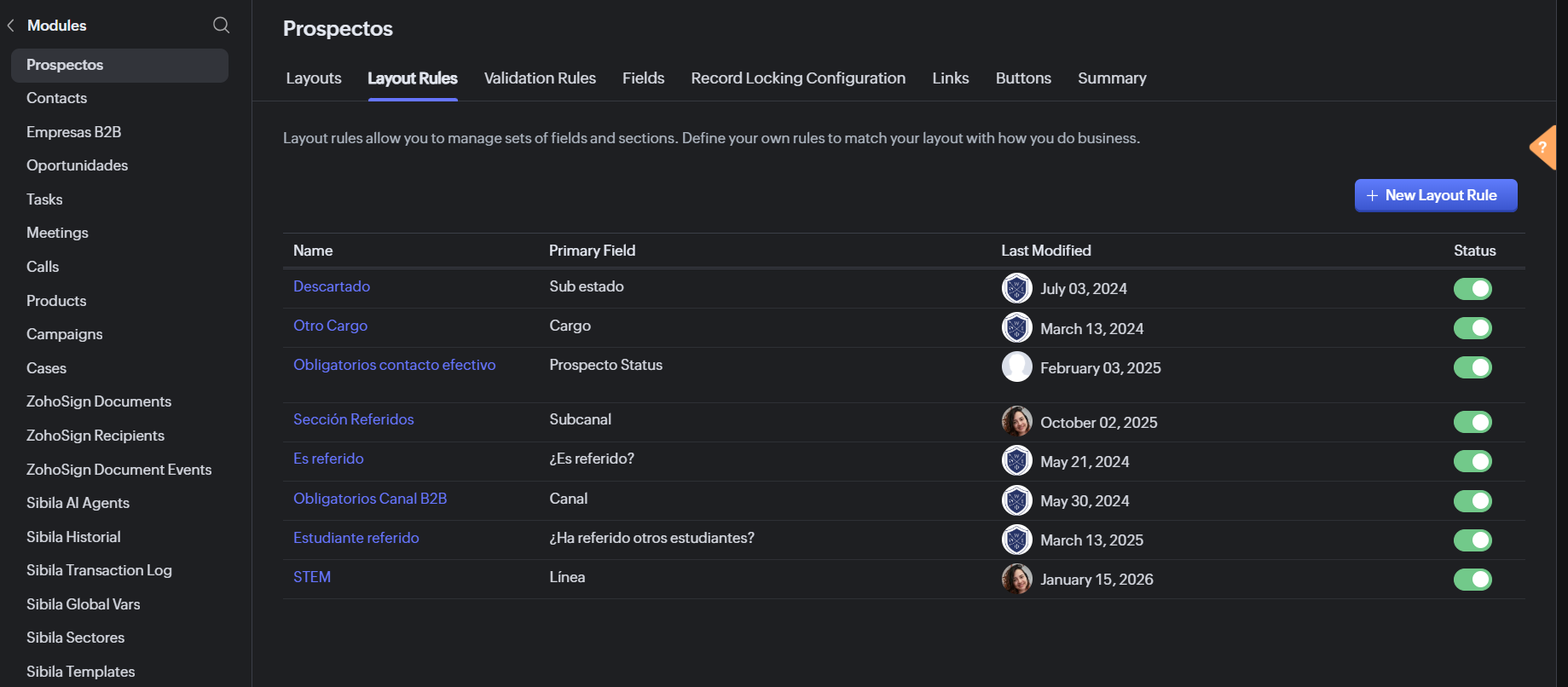 Tener en cuenta que los campos obligatorios desde layout es muy probable que desconfiguren y hagan fallar las automatizaciones que se tienen en zoho flow desde el CRM hacia otras herramientas de integración.1) Hacer un campo obligatorio desde el Layout