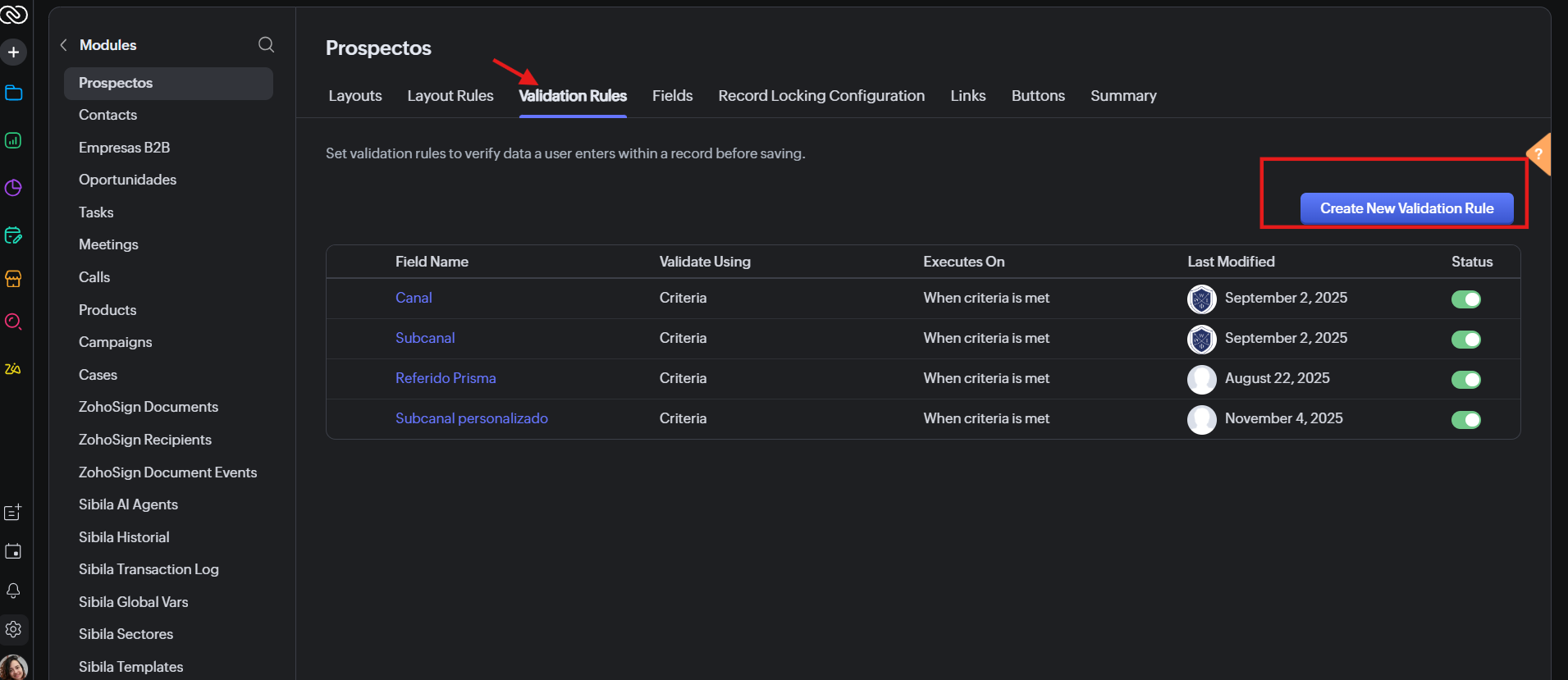 Buscar la sección de Validation Rules (Reglas de validación).