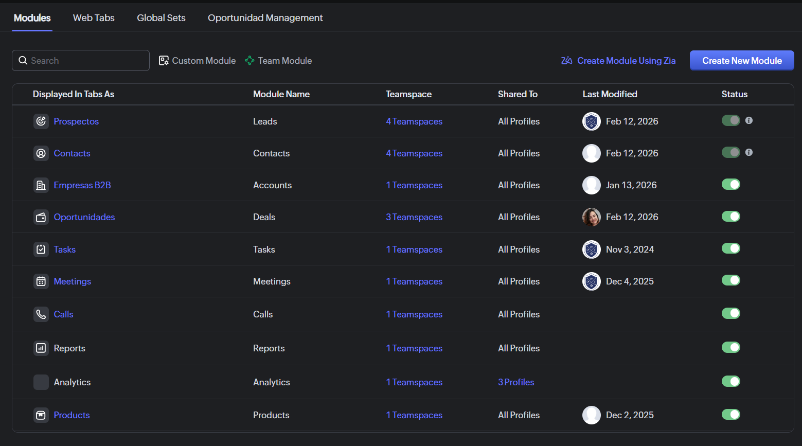 Seleccionar el módulo (Leads, Contacts, Deals, etc.)