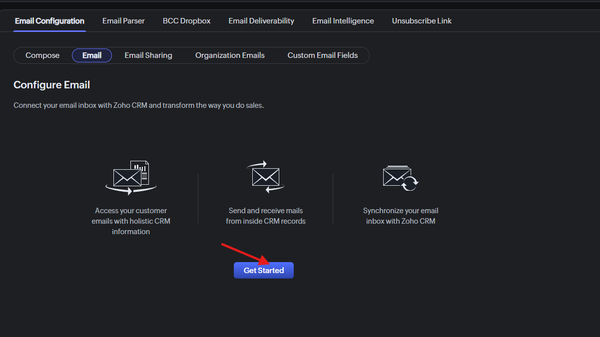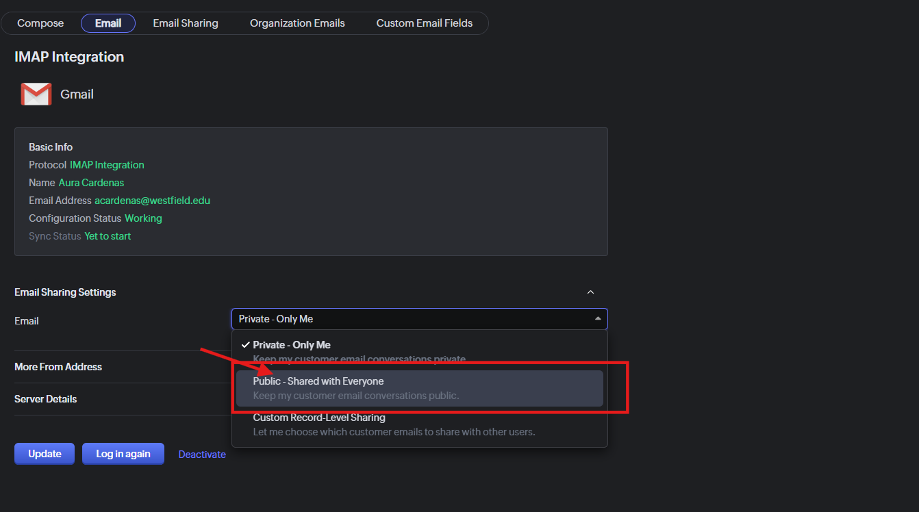 Debemos configurar la opción que esa configuración sea publica, de otra manera no se podrá ver desde el historial de emails dentro del lead.