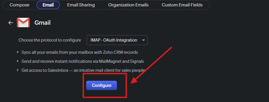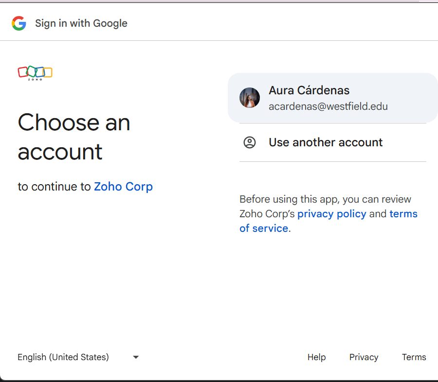 Nos solicitará realizar el login en google para dar autorización a zoho que se integre con nuestro correo.