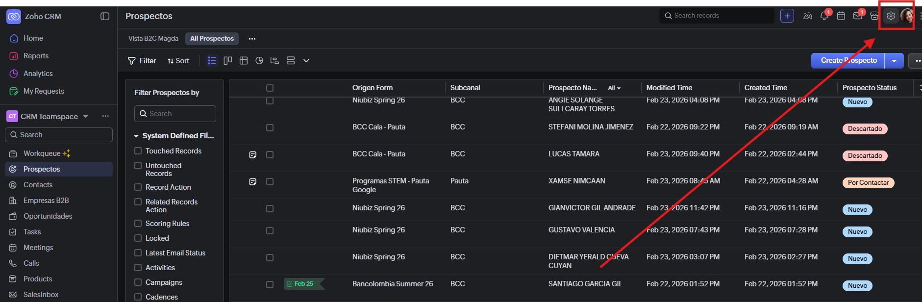 Buscamos la rueda dentada dentro del CRM que pertenece a las configuraciones o setup.