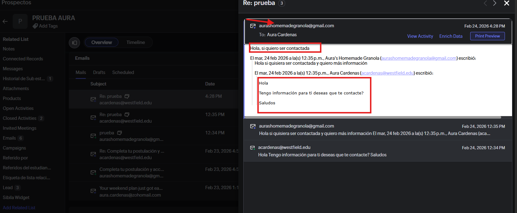 De igual forma se puede seguir viendo la conversación directamente en la bandeja de correo del propietario del lead.